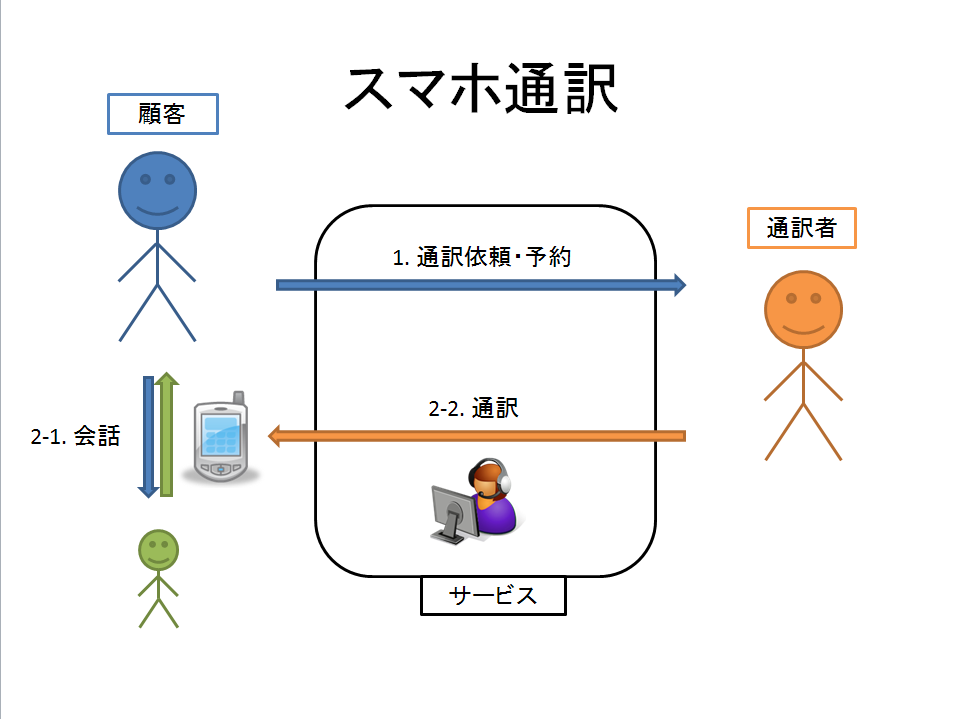 ユーザーは利用したい時間を予約し、通話用アプリ(Skype のようなビデオ チャットを想定)が入ったスマートフォンまたはタブレットを現場に携行する。アプリを起動すると、遠隔地の通訳者とオンラインで対話できる。ユーザーはスマートフォンに聞こえるように発声し、現場での会話を通訳してもらう。